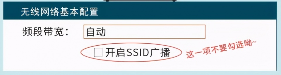 在无线网络基本设置界面中把“开启SSID广播”前的对勾去掉,这样其他人在搜索WiFi时就无法搜到这台设备的名称了,从而大大降低蹭网的可能。